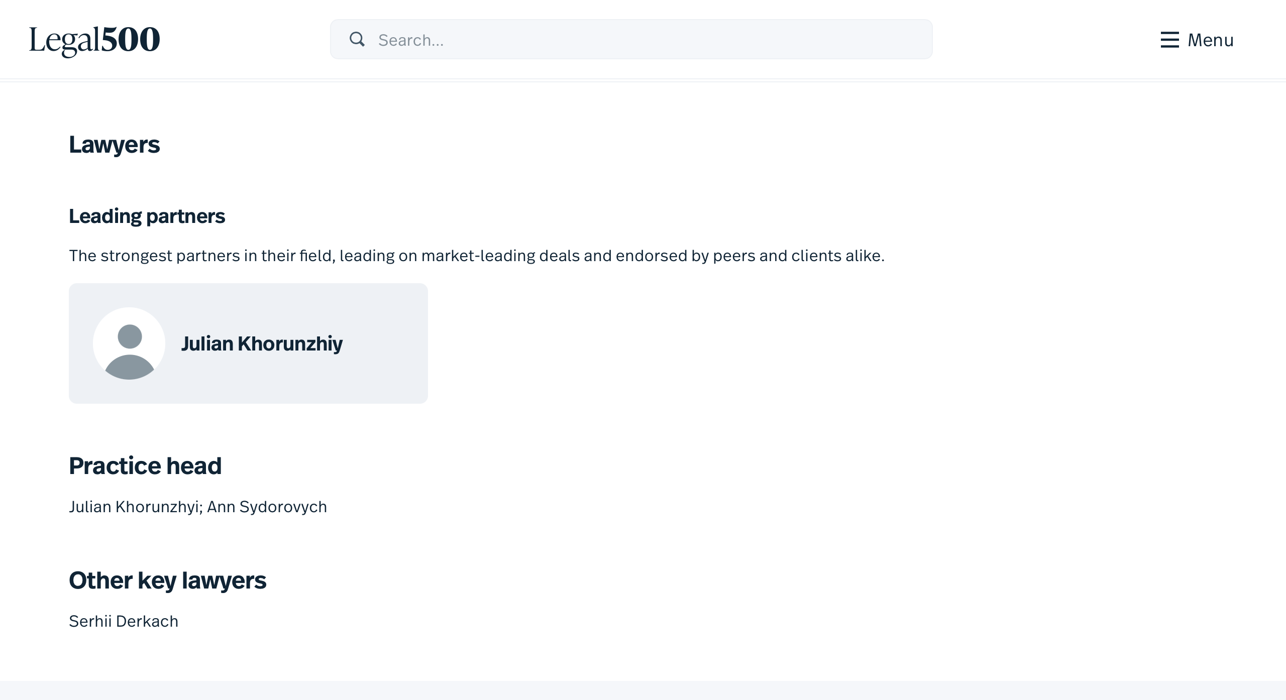 Практику співочолюють старший партнер Юліан Хорунжий, який має глибоку експертизу у банкрутстві та корпоративній реструктуризації, і партнерка Анна Сидорович, яка спеціалізується на M&A, податкових та корпоративних питаннях. Окремо рейтинг відзначає партнера Сергія Деркача, який консультує щодо структурування корпоративних моделей та створення консорціумів, супроводжуючи складні українські й транскордонні інвестиційні проєкти.