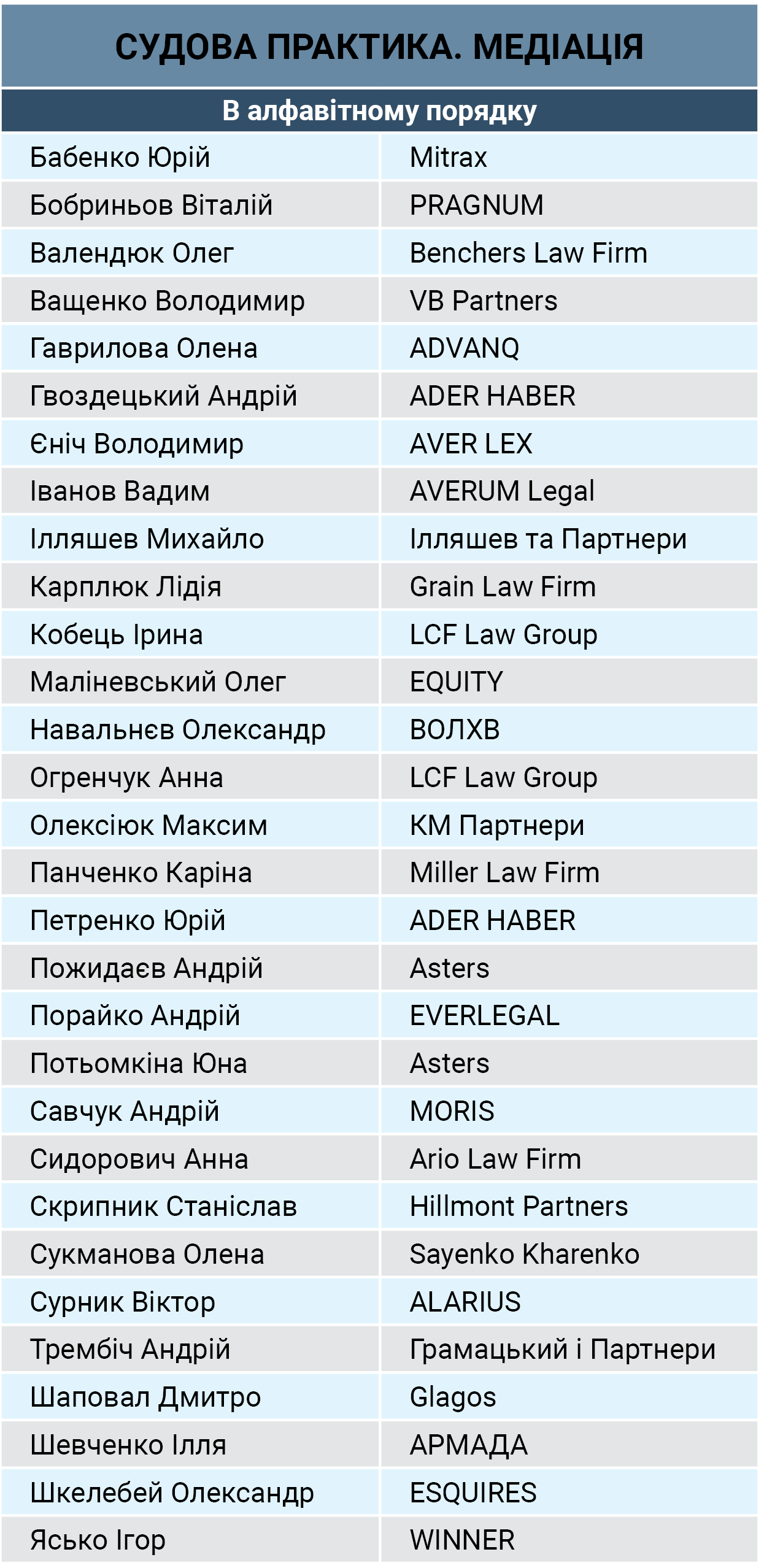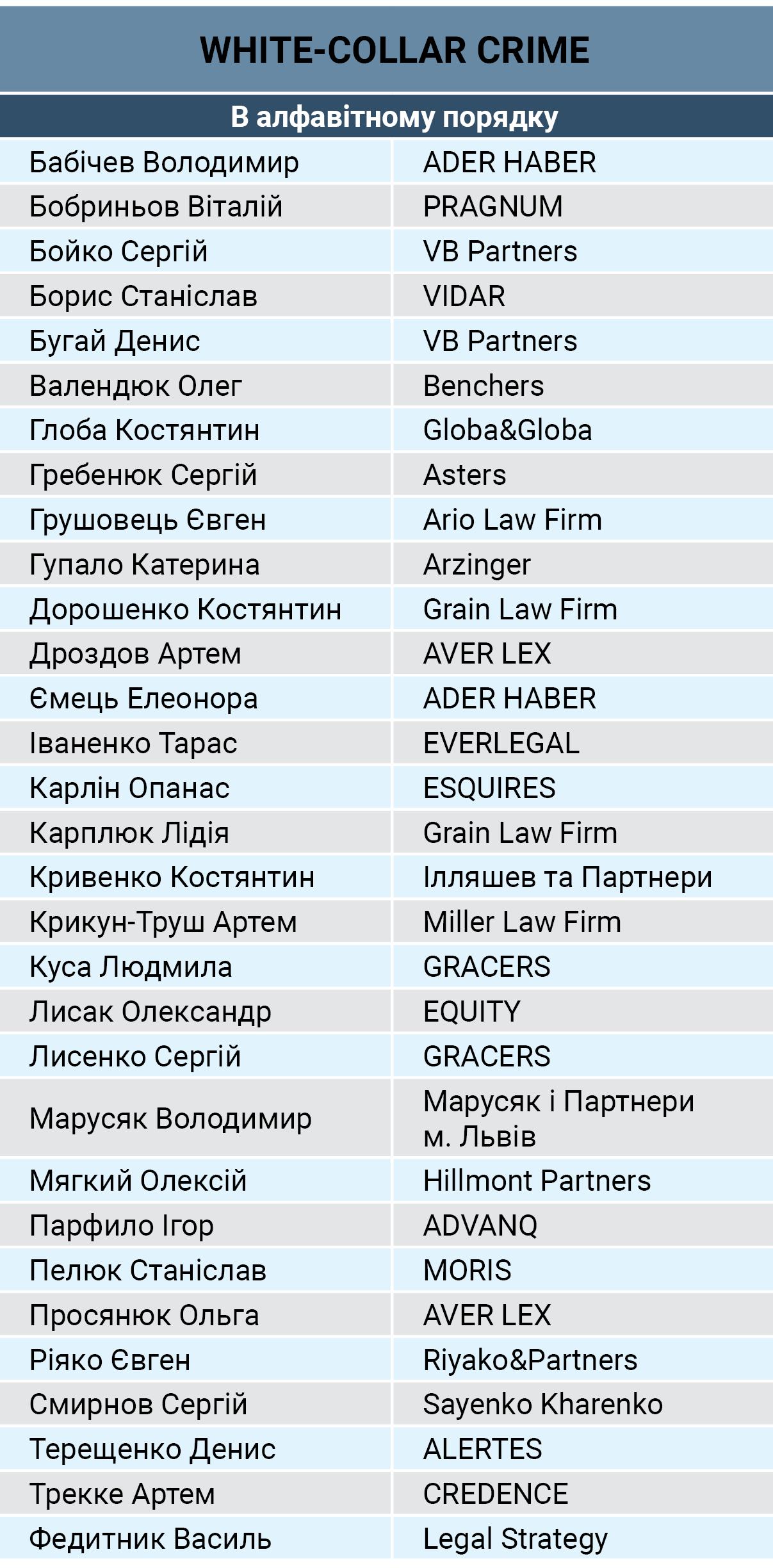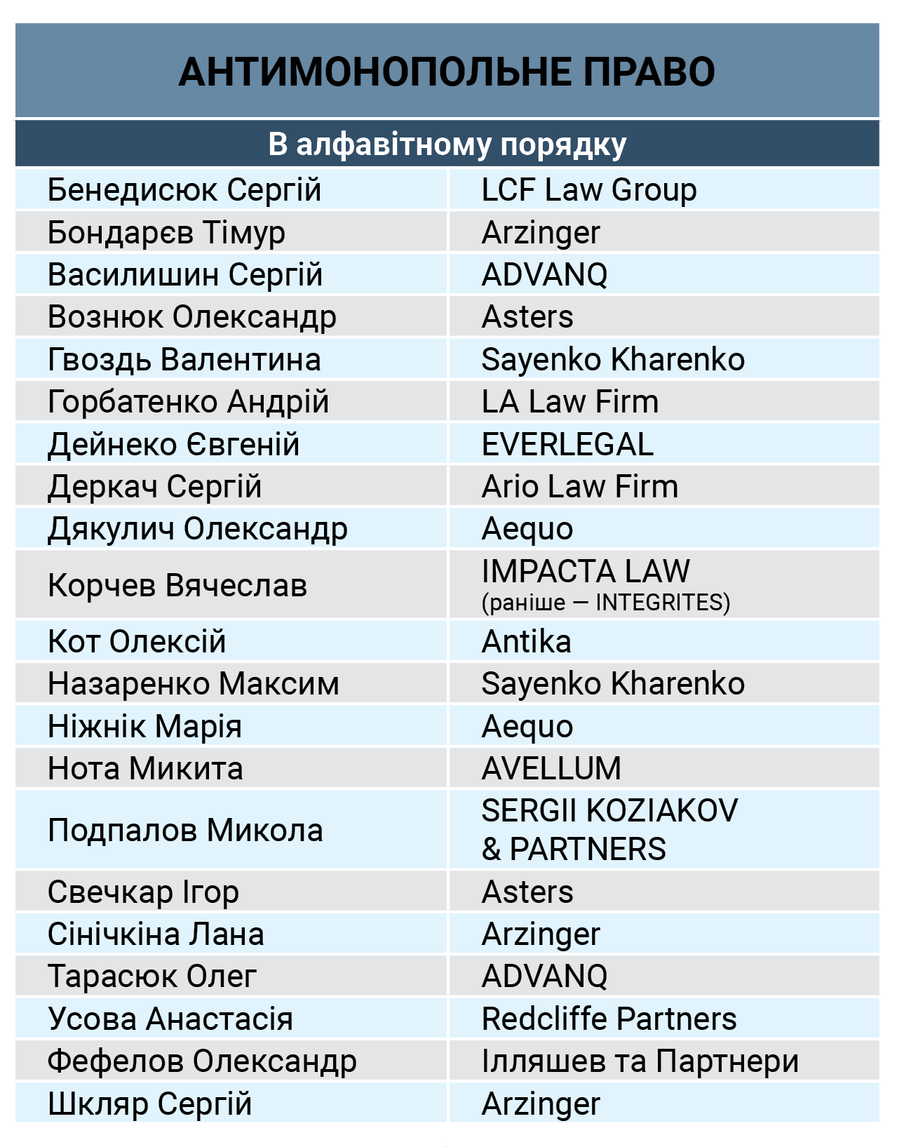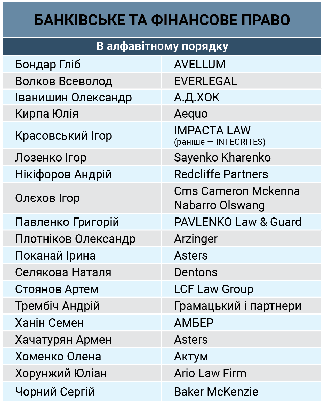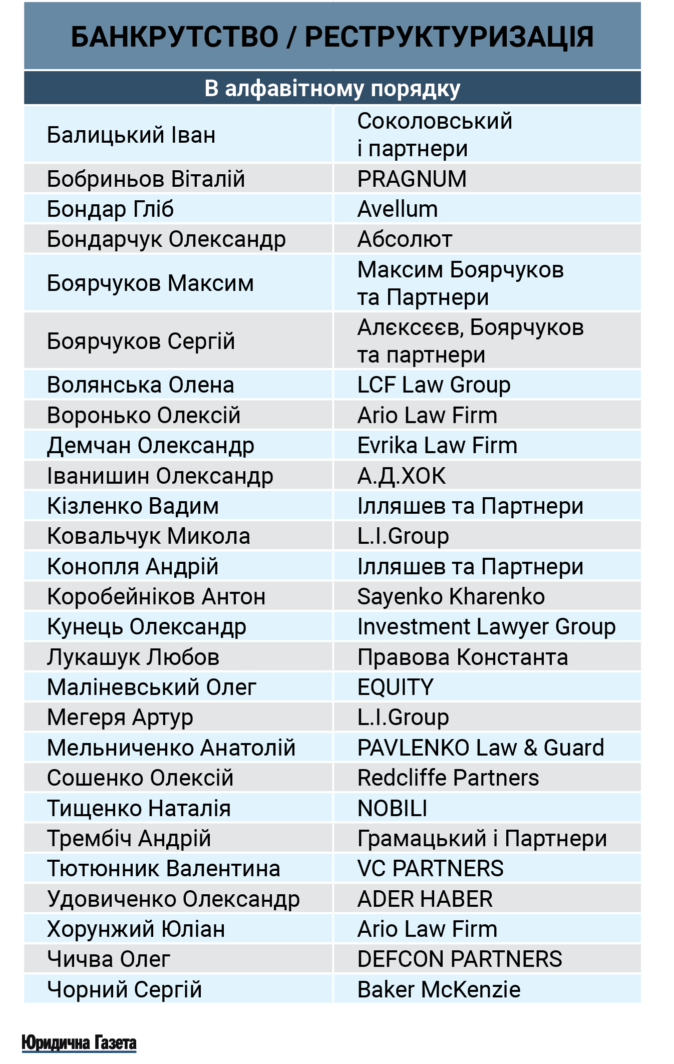 - Банкрутство та реструктуризація: Олексій Воронько, керуючий партнер; Юліан Хорунжий, старший партнер