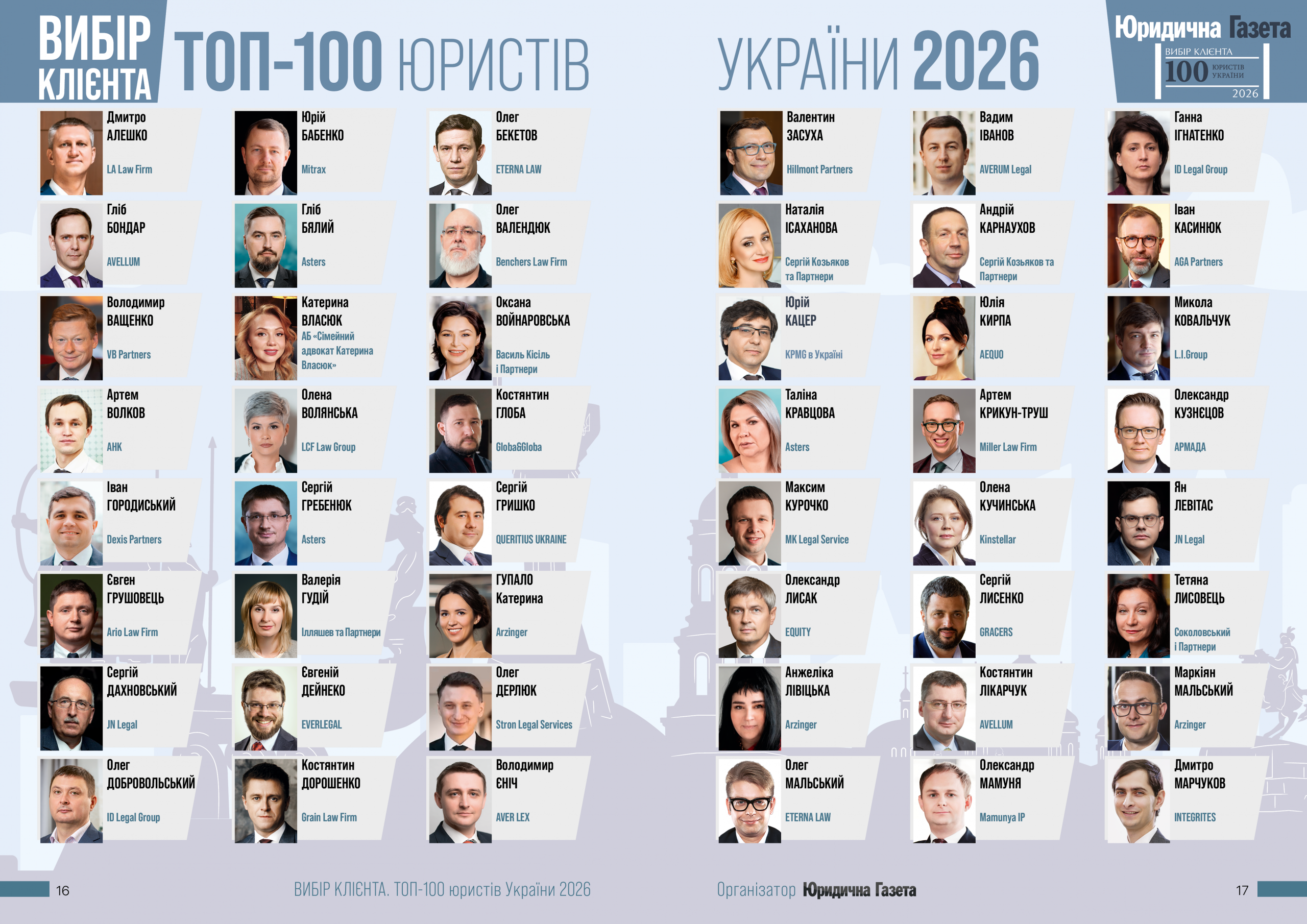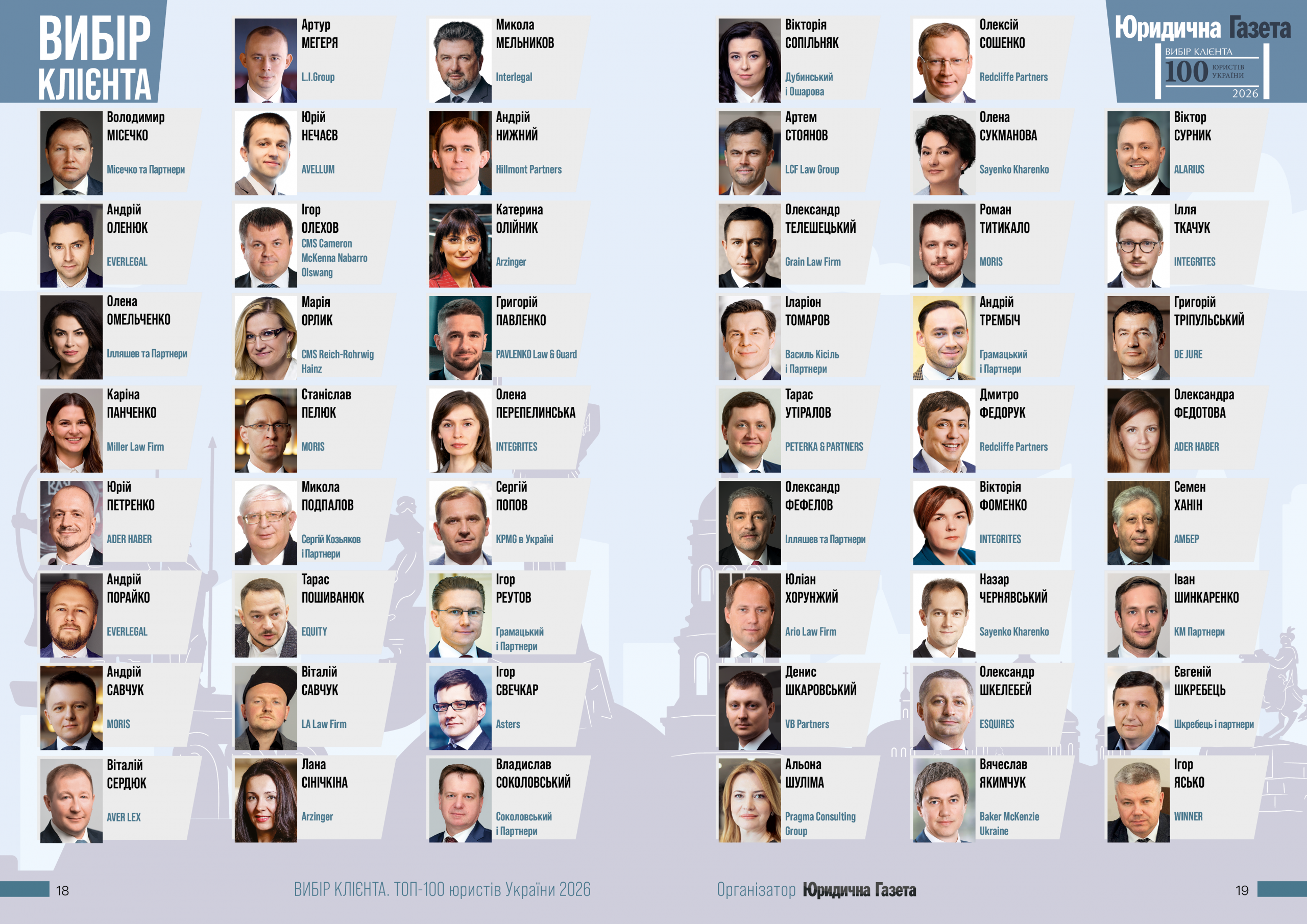 «ТОП-100 юристів України» є однією з частин проєкту «Вибір клієнта». Це ренкінг, в якому імена подано в алфавітному порядку без розподілу за місцями. Потрапляння до списку свідчить про помітну роль юриста у своїй практиці та сталу професійну репутацію серед клієнтів і колег. До ТОП-100 увійшли представники різних сегментів ринку: міжнародних юридичних фірм, національних компаній і бутикових практик.
