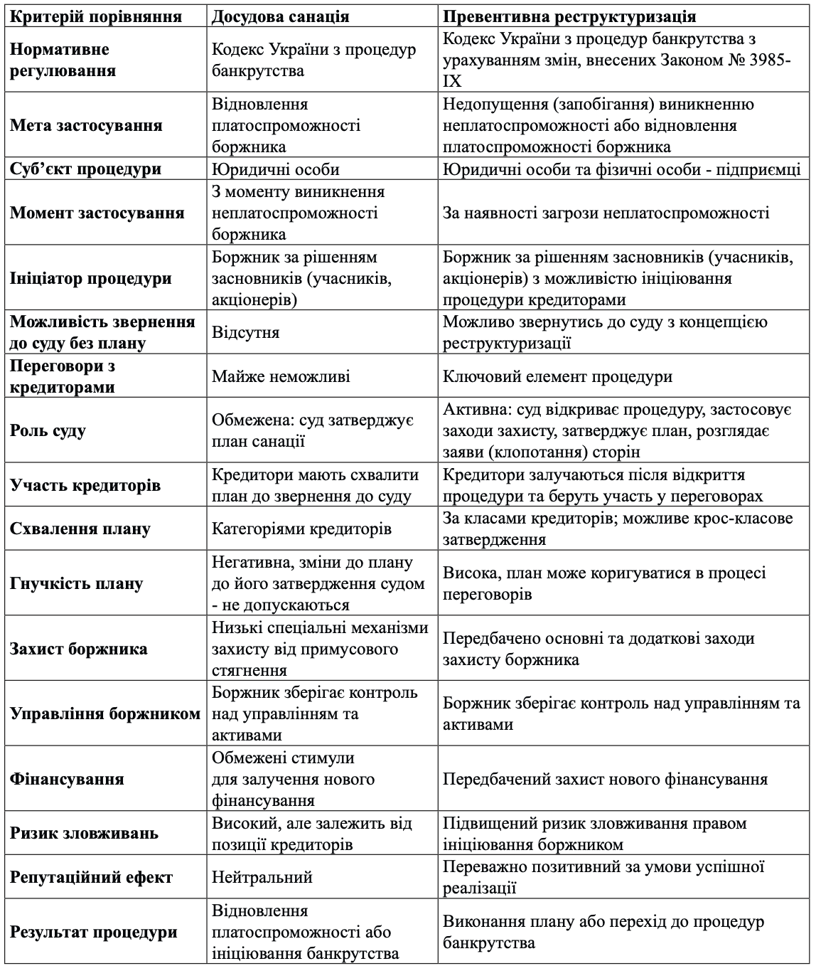 З метою узагальнення результатів проведеного дослідження та систематизації ключових відмінностей між досудовою санацією і превентивною реструктуризацією доцільним є застосування порівняльного підходу. Хоча основні засади зазначених процедур вже були проаналізовані, однак хочу зупинитись на ключових позитивно-негативних відмінностях. Саме такий підхід дозволяє наочно продемонструвати спільні риси та принципові розбіжності зазначених правових інститутів, а також оцінити їх функціональне призначення в системі процедур відновлення платоспроможності боржника. У зв’язку з цим у таблиці 1 наведено порівняльну характеристику досудової санації та превентивної реструктуризації за ключовими критеріями, зокрема нормативним регулюванням, моментом застосування, роллю суду, участю кредиторів, рівнем гнучкості плану, наявністю механізмів захисту боржника та потенційними ризиками практичного застосування.